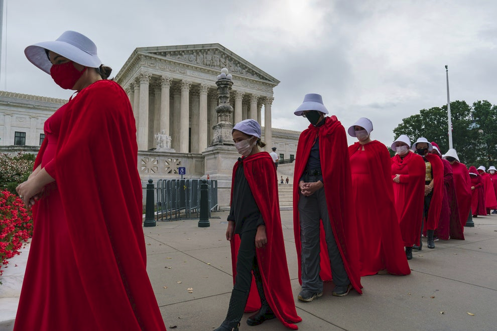 Demonstrators dressed as characters from The Handmaid’s Tale oppose Judge Amy Coney Barrett’s confirmation at the Supreme Court on 11 October 2020 (AP Photo/J. Scott Applewhite)